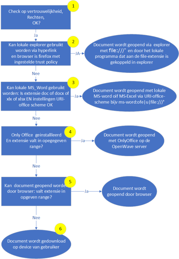 Indien vertrouwelijkheid OK en de instellingen zijn dusdanig dat het programma geen poging doet het bestand via een hyperlink met firefox of Office URI-scheme te openen dan: